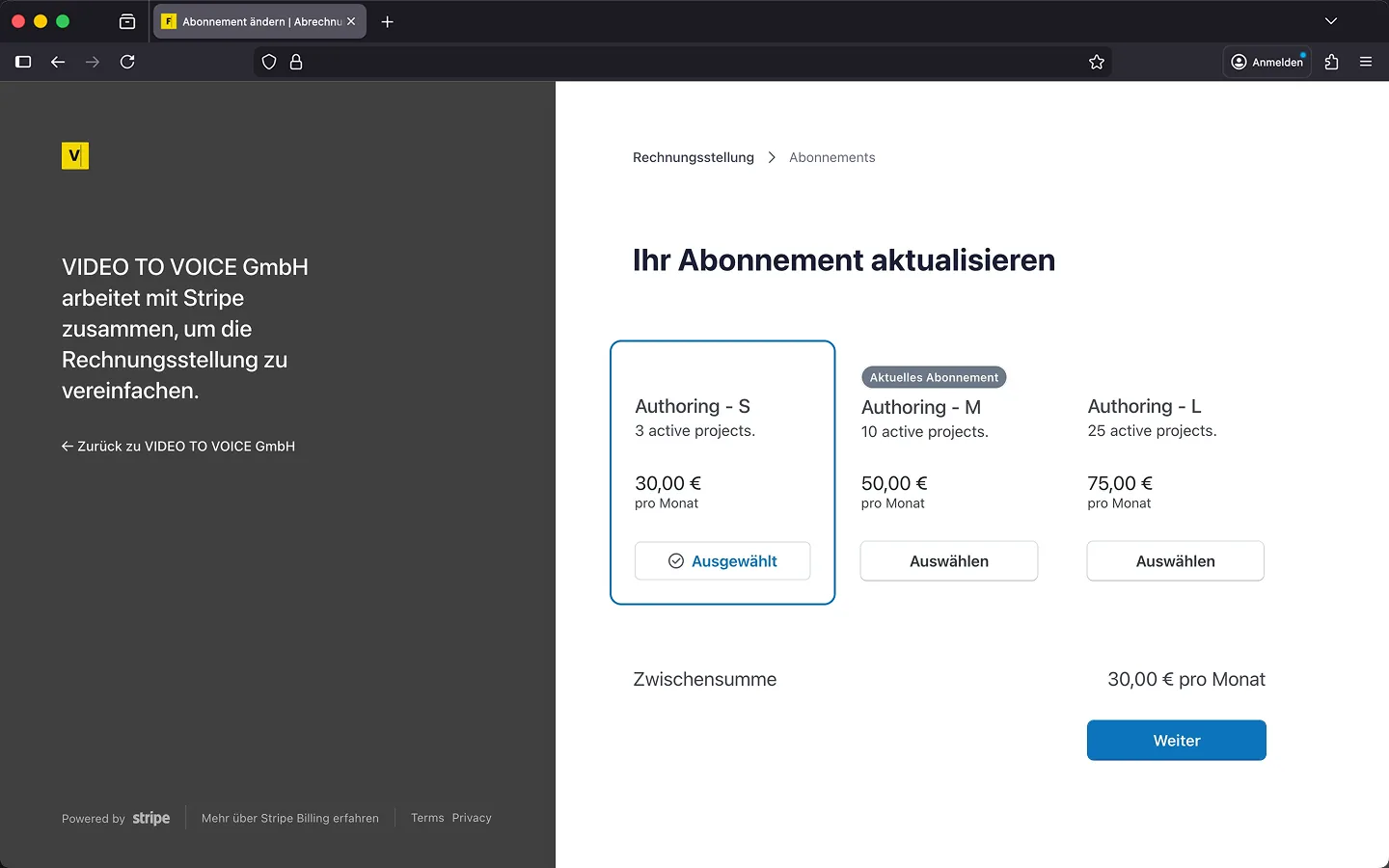 Du kannst Dein aktuelles Abonnement jederzeit anpassen. Stripe verrechnet automatisch Planwechsel und stellt sofort Deinen Frazier-Account um.
