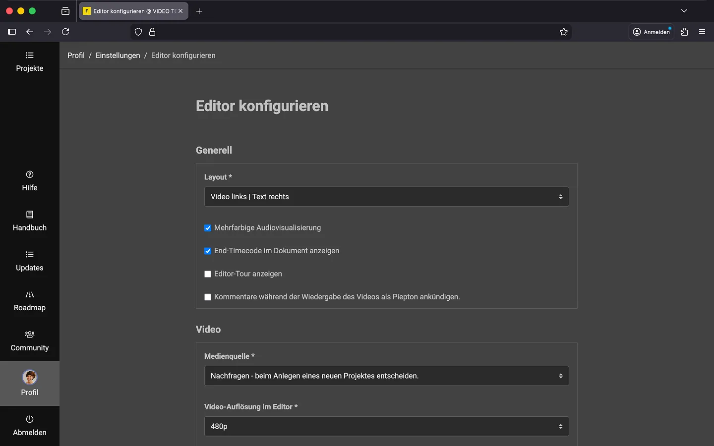 - Die Wiedergabe des Videos hängt von der Geschwindigkeit der Internetverbindung ab. Standardmäßig wird eine verkleinerte Version des Films im Editor angezeigt, um Bandbreite zu sparen. Hast Du eine sehr gute Internetverbindung (>50 Mbit/s), kannst Du die Bildqualität erhöhen. Beachte, dass das nur für neue Projekte gilt, da die Einstellung bei der Initialisierung des Projektes berücksichtigt wird.