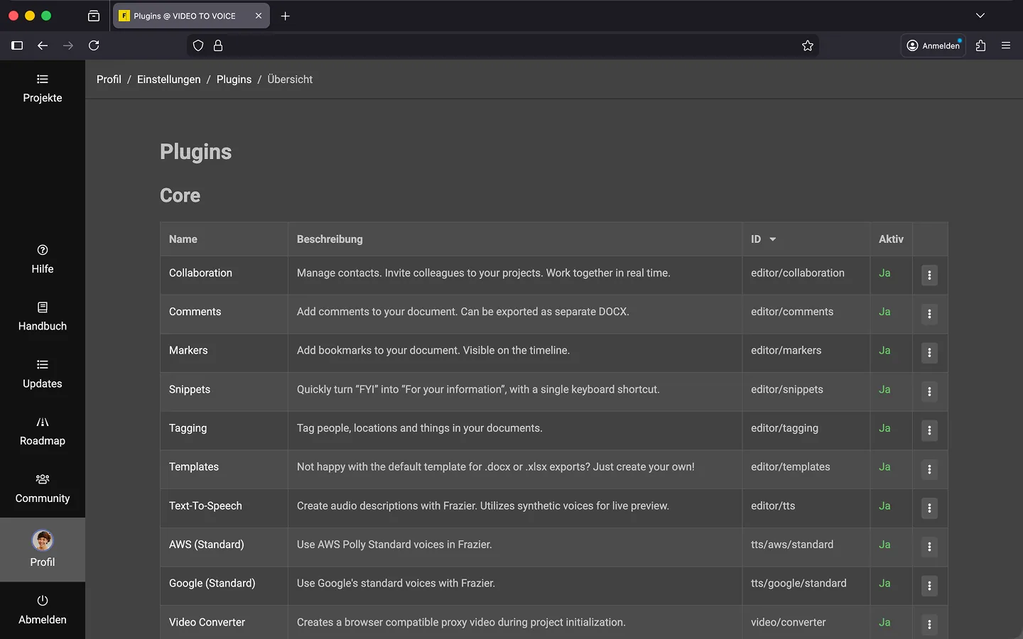 Diese Plugins sind standardmäßig in Deinem Frazier-Account aktiviert, damit Du auf alle Funktionen zugreifen kannst. Falls Du ein Plugin nicht nutzen möchtest, kannst Du es hier deaktivieren.