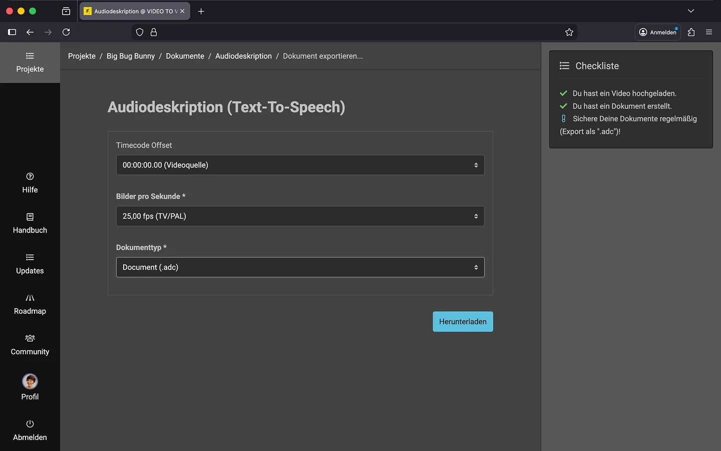 Wichtig! Bitte nutze ausschließlich die .adc-Datei als Sicherheitskopie für Deinen Rechner. Die anderen Formate, die beim Export zur Verfügung stehen (z. B. .docx), enthalten nicht alle notwendigen Daten (wie z. B. die zum Vorlesen verwendete Stimme, Kommentare und Chatverläufe usw.). Auch wenn Dein Auftraggeber Dich nur nach einer .docx-Datei fragt, solltest Du für Dich selbst immer noch die .adc-Datei mit abspeichern.