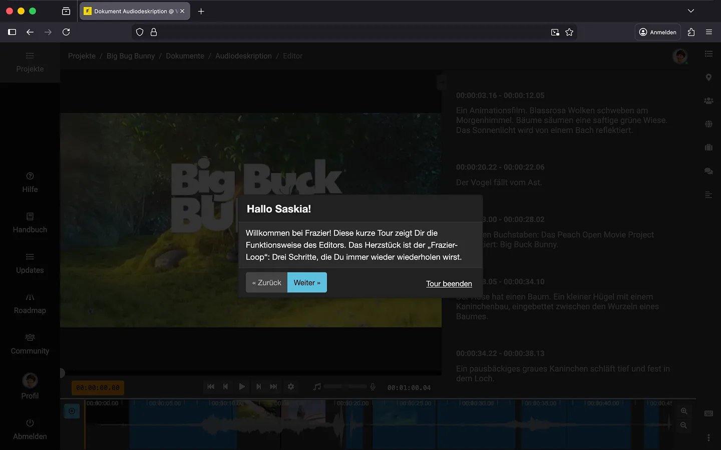 Damit Du ohne Umwege den Editor testen kannst, haben wir für Dich ein Demo-Projekt vorbereitet. Es enthält einen kurzen Ausschnitt aus dem Film „Big Buck Bunny“.