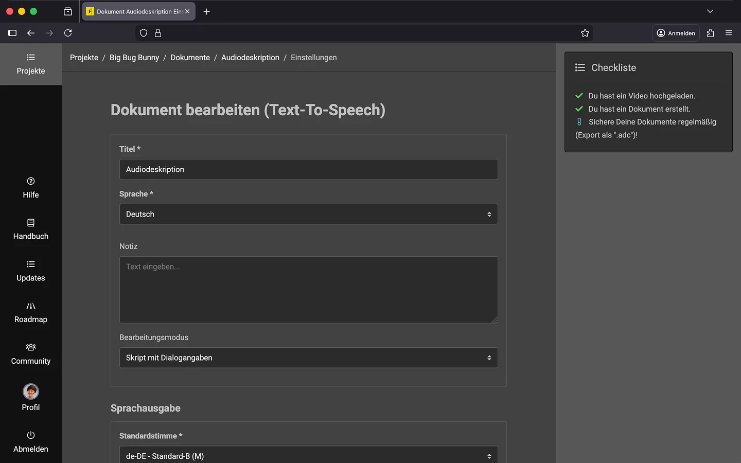- Diese Option steht zur Verfügung, wenn Du bereits im Texte erstellt hast, und nun nachträglich die Stimme für alle Texte ändern willst. *