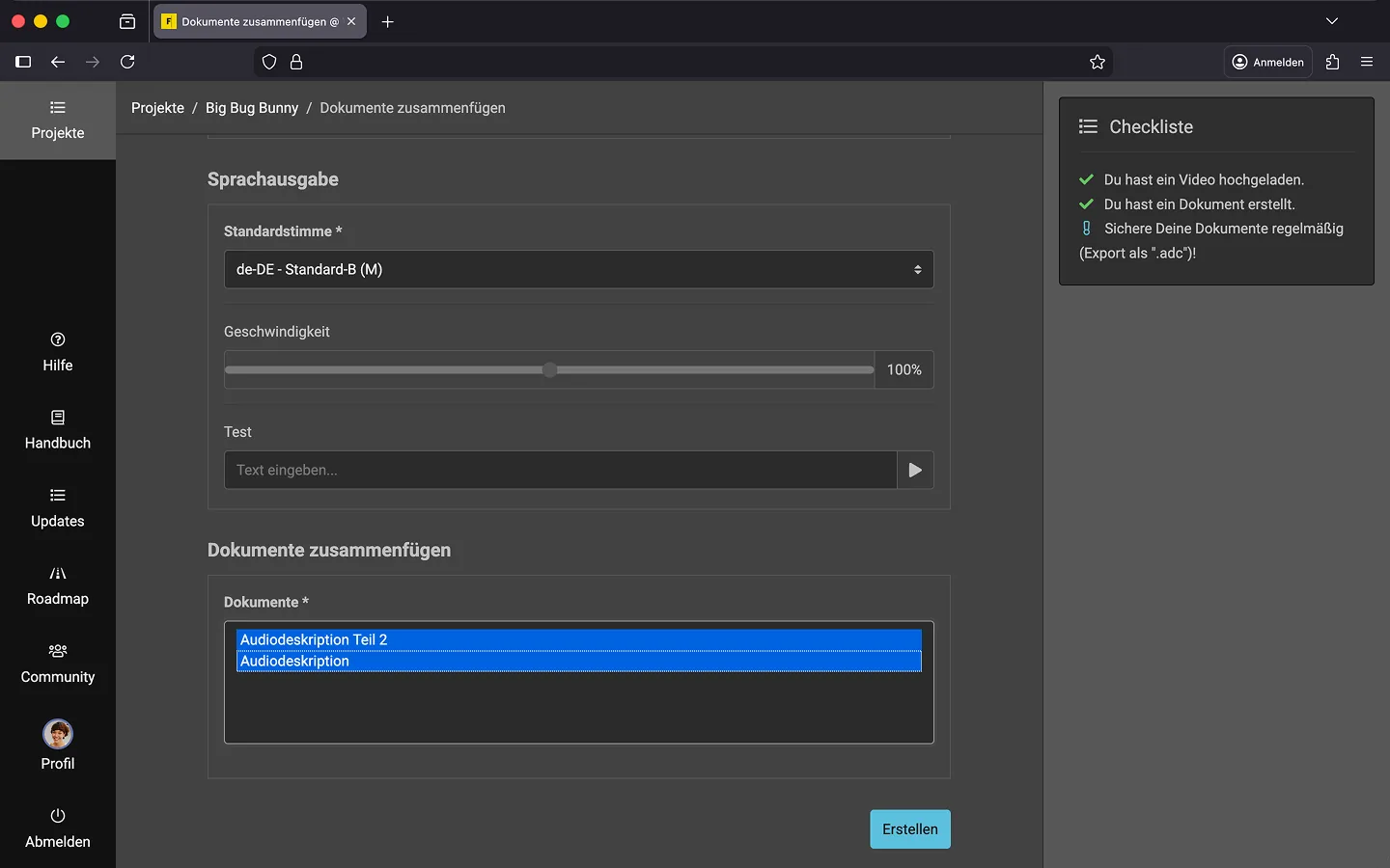 - Füge die bestehende Audiodeskription und die neuen Untertitel wie oben beschrieben zu einem neuen Dokument zusammen.