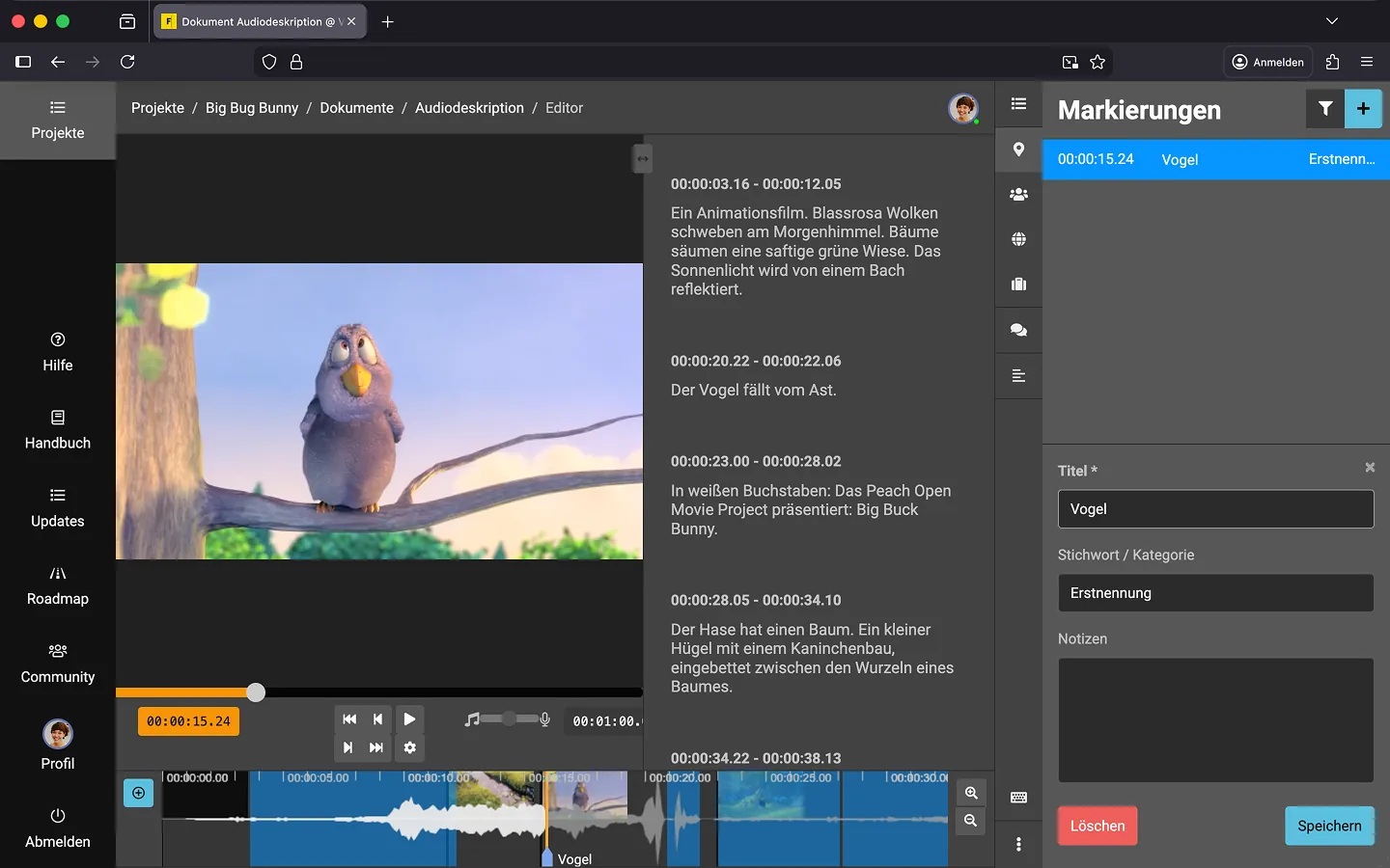 Du willst eine Stelle im Film markieren? Für eine Erstnennung, oder für spätere Recherchen? Nutze „Markierungen“, um kleine Lesezeichen auf der Zeitleiste zu platzieren.