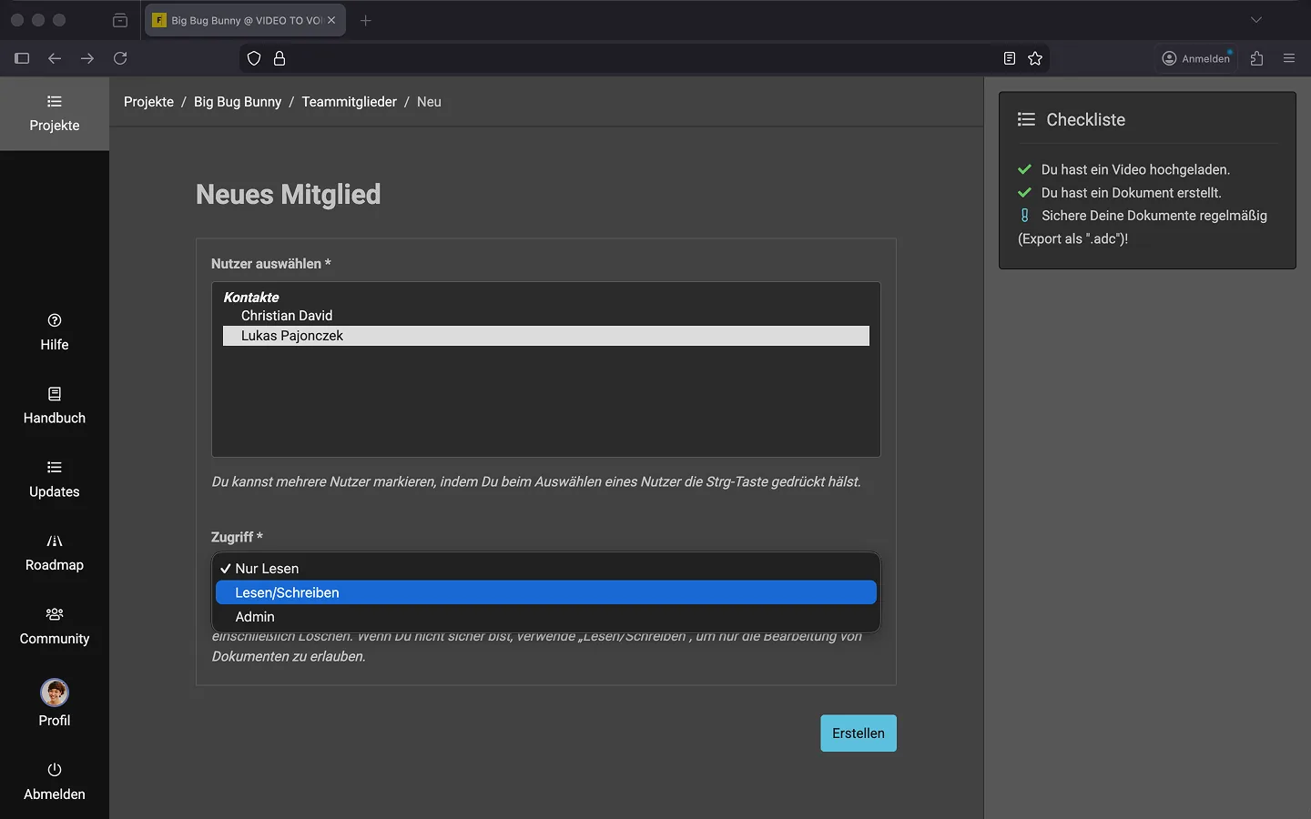- Admins dürfen in Deinem Projekt fast alles machen - Videos hochladen, Dokumente bearbeiten, das Team zusammenstellen usw. Löschen, archivieren oder übergeben des Projektes sind allerdings nicht möglich.