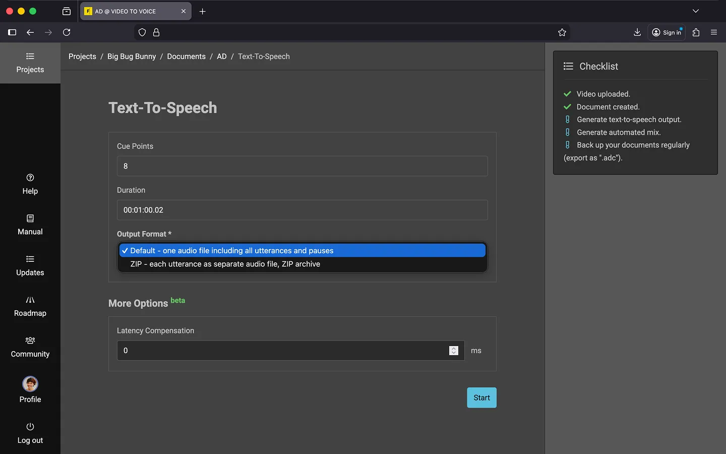 - This option is used if the individual voice snippets are used later and pauses between them are not relevant. This option is not suitable for automated mixing of audio descriptions.