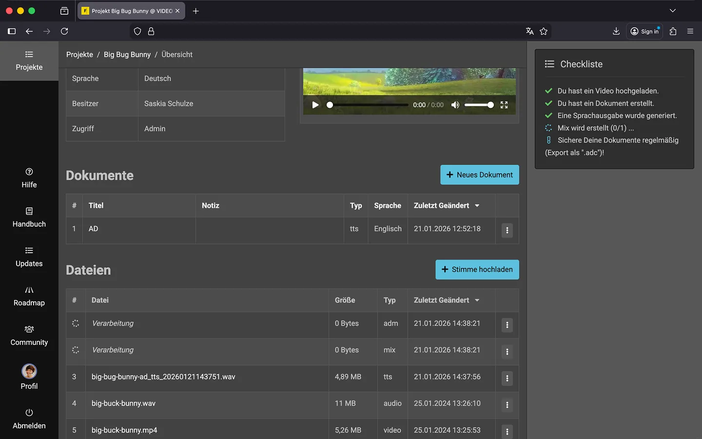 Frazier “Production” offers advanced features for exporting audio files and creating automatically mixed audio descriptions. This makes it possible to produce text-to-speech audio descriptions (TTS-AD) efficiently.