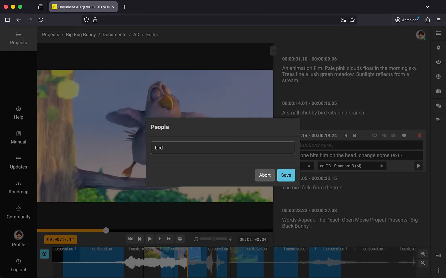 - Click a tag to view the associated descriptions, including timecodes.