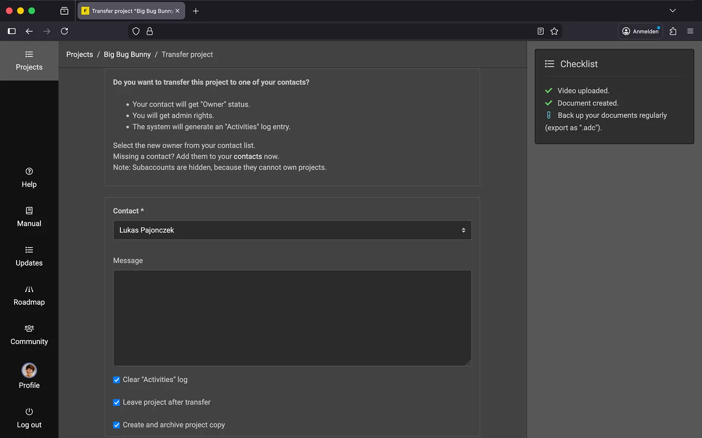 - Optional: Activate the “Leave the project after transfer” option. This is useful if you are certain that you will never need to access the project again after transferring it.