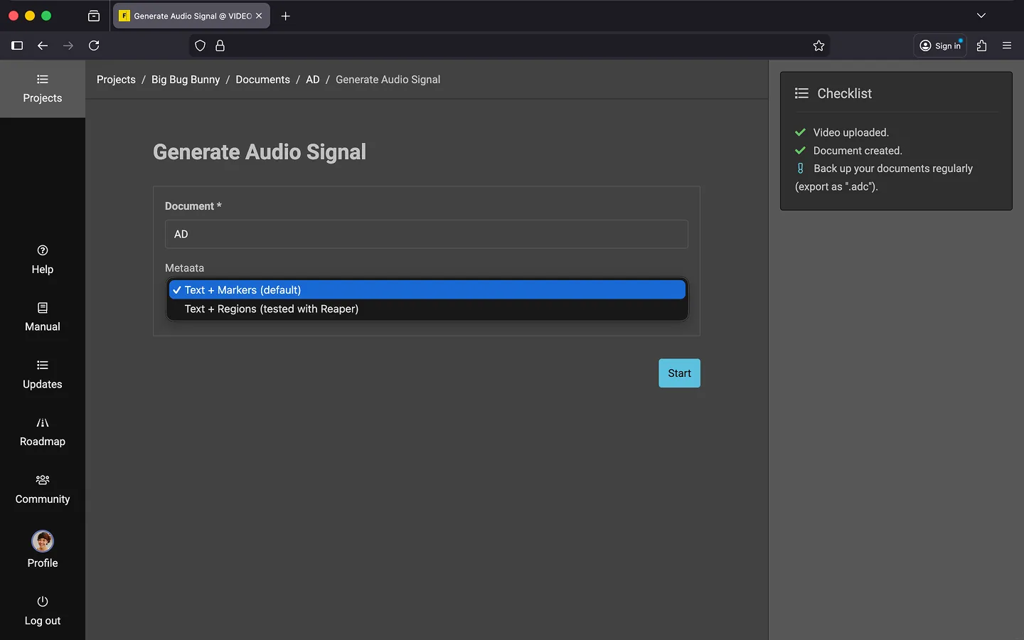 You can start generating the audio signal from both the project overview and directly from the editor.