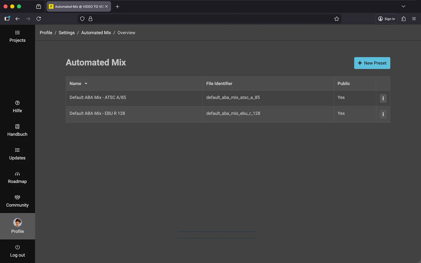 Tip: You can duplicate one of the standard presets for EU (EBU R 128) or USA (ATSC A/85) as a starting point. This provides useful default values, making it easier to adjust only the parameters you need instead of creating a preset from scratch.