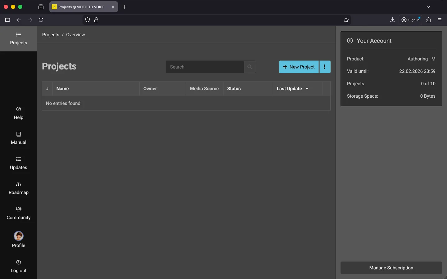 In the first step, choose the plan you want to subscribe to. The plans differ only in the number of active projects, not in features. Consider how many audio descriptions you expect to create in the coming month. If you have only a few projects, start with “Authoring - S.” For regular audio description work, we recommend the “Authoring - M” plan.