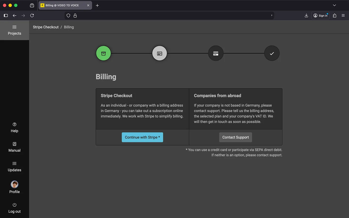 Stripe Checkout supports payment by credit card and SEPA direct debit. If neither option works for you, please contact support. Otherwise, enter your account details and billing address. Double-check your plan selection and the amount.